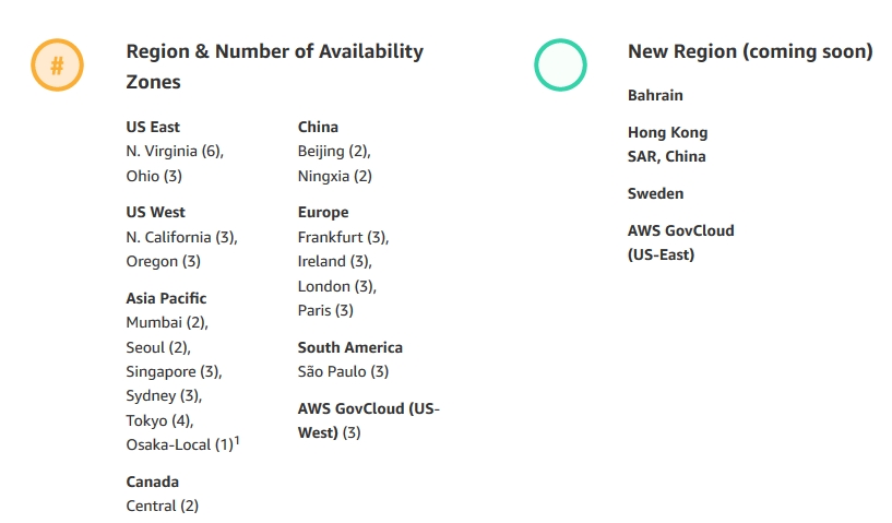 As of this writing, the AWS Cloud spans 55 Availability Zones within 18 geographic Regions and 1 Local Region around the world, with announced plans for 12 more Availability Zones and four more Regions in Bahrain, Hong Kong SAR, Sweden, and a second AWS GovCloud Region in the US.source: Amazon Web Servicessource: Amazon Web Services