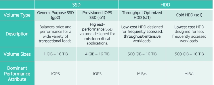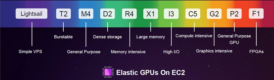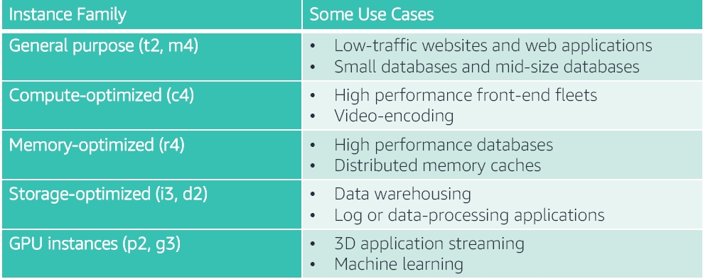 Users can select from a growing number of EC2 classifications, each one customized at the hardware level for different use cases. While some applications may do well with general purpose instances, others may require optimized hardware for specialized workloads.source: Amazon Web Services