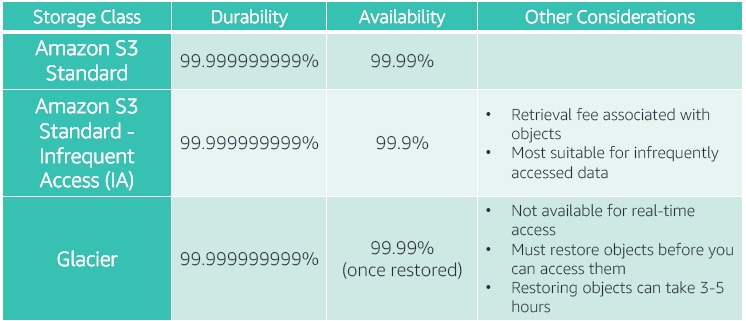 Designed for 99.999999999% durability and 99.99% availability of objects over a given year
