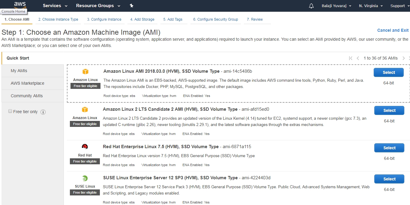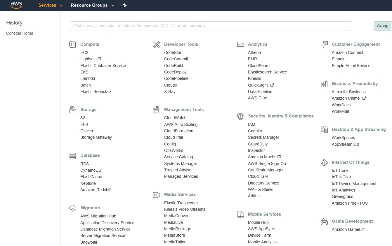 Once you login to the console, you will be taken to the Console homepage that lists all the services that AWS has on offer. From here, you can select an available service and start building. There is extensive documentation for each service that helps you setup your project. AWS Console homepage listing the various services available. Source: Amazon Web Services