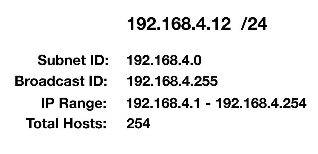 Going back to our IP address, 192.168.4.12, we need to identify its subnet, broadcast address and range of IP addresses used. Here is a brief explanation of those variables we are looking for.