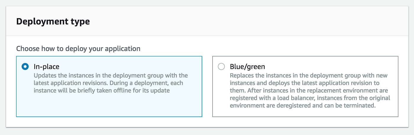 Next, you can select the deployment type. To keep this simple, I have kept it as In-place but as you can see we can even do blue/green deployments if needed;