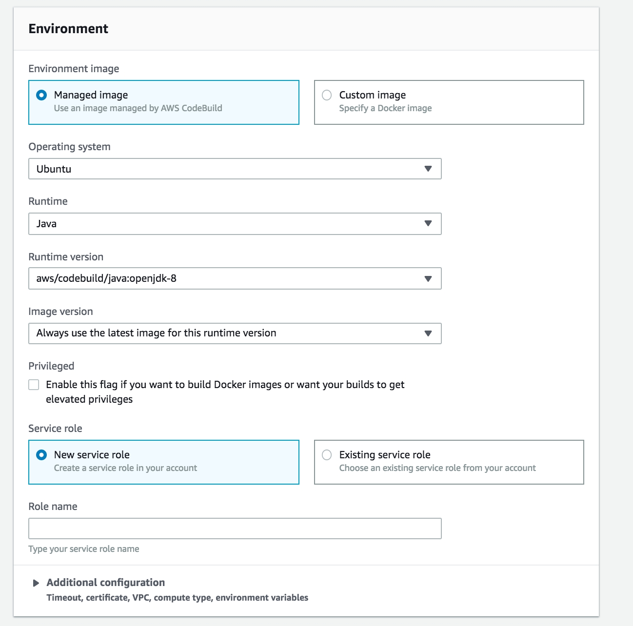Next, we need to specify the image we need to run our build. In this case, I have selected an AWS CodeBuild managed instance. Note that a new service role will be created as part of this process. This role will grant S3 and CloudWatch: