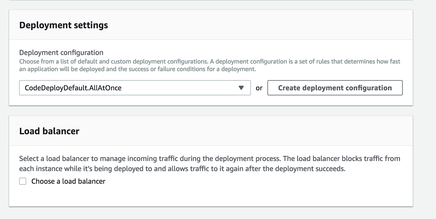 Finally, provide the deployment settings you need. In my case, I have selected them all at once. If you wanted to do a rolling update, you can do that too. As I am not using an ELB in this example, I have not ticked the load balancer: