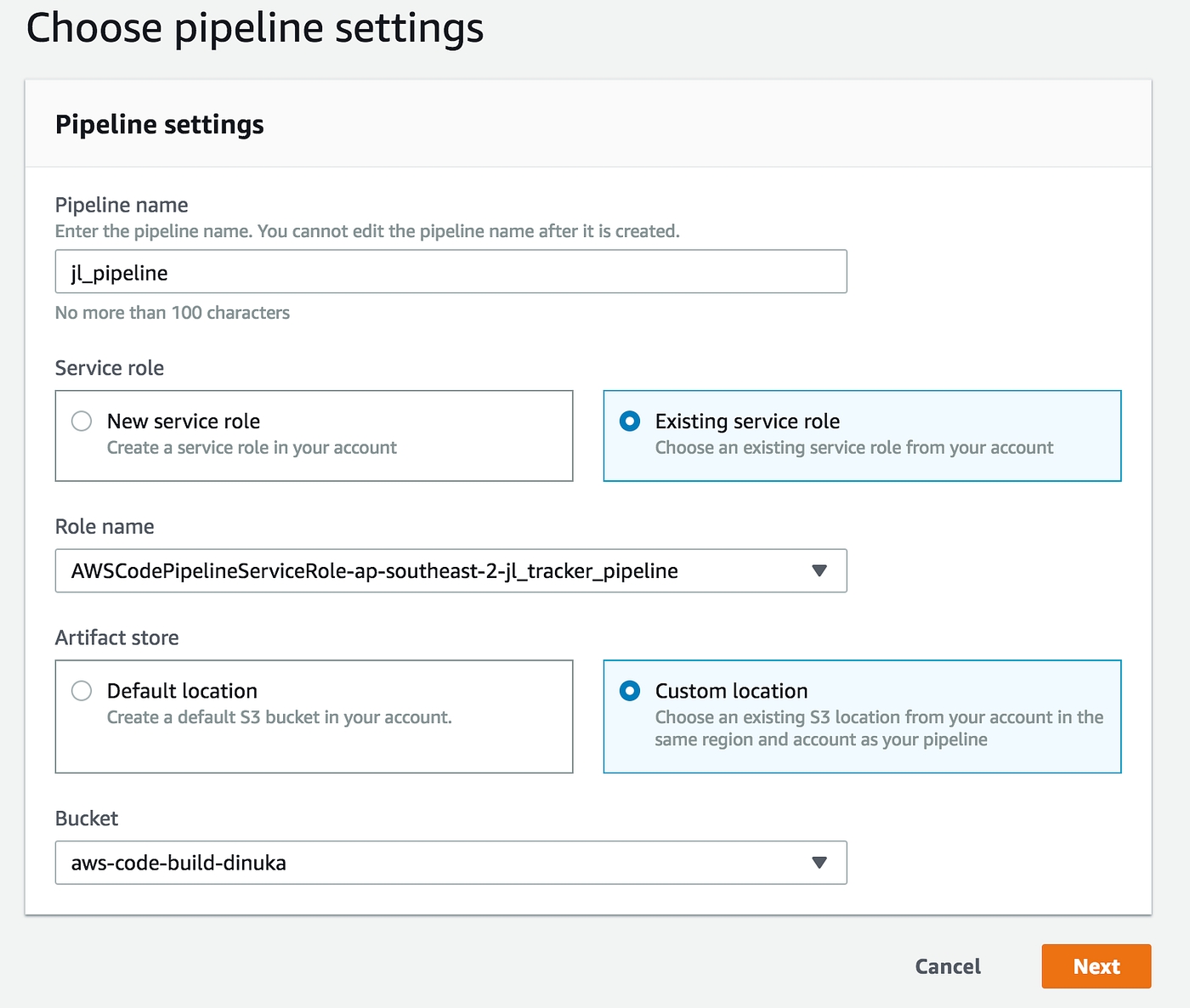 We start off with giving the pipeline a name and assigning an IAM role. In my case, I already had a defined role. You can let CodePipeline create a bucket for you, or you could use a bucket you already have which is what I have done in this instance.