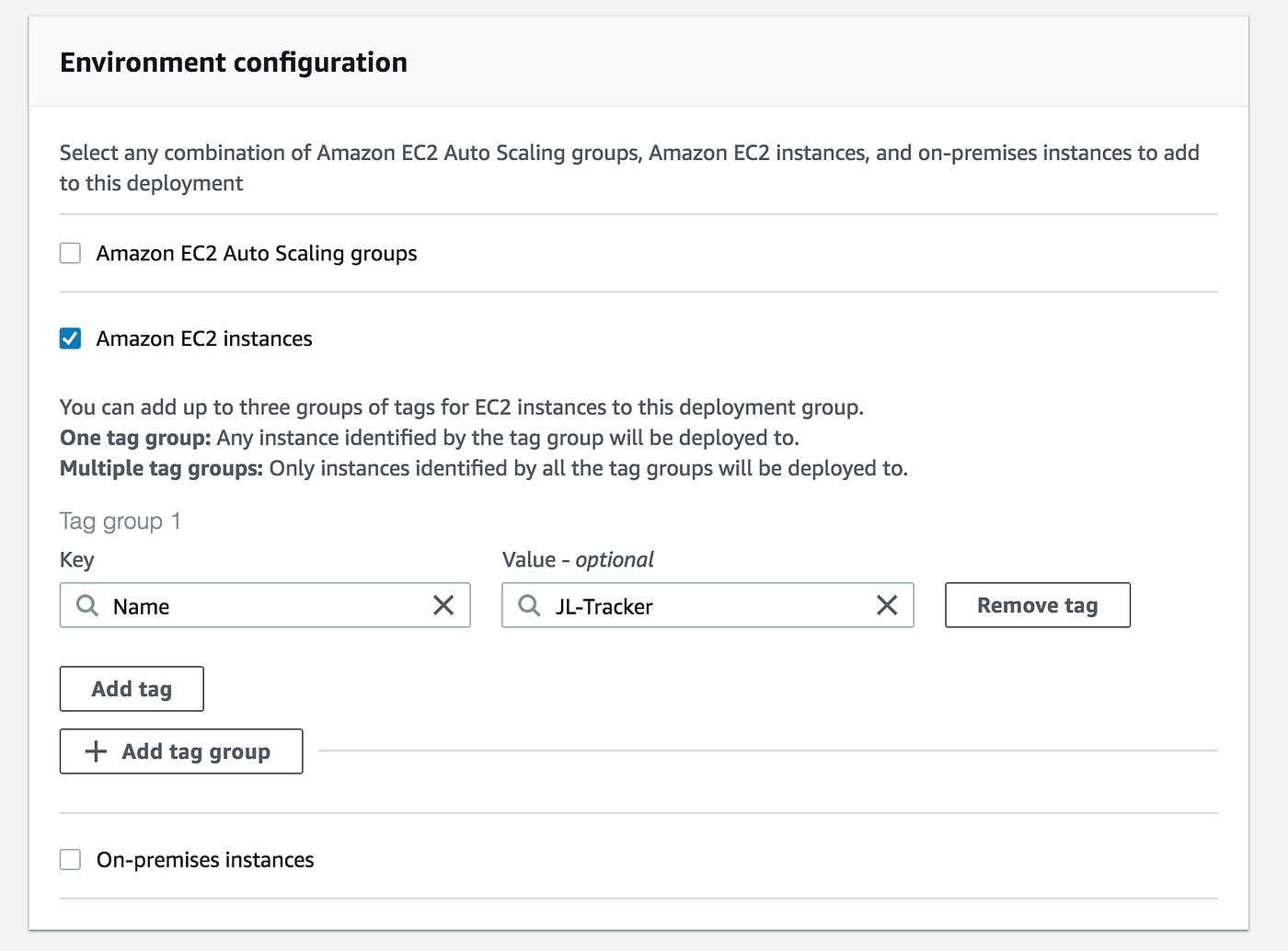 In the next section, mention how CodeDeploy will find your instances. In my case, I select the tag I created before to identify by EC2 instance: