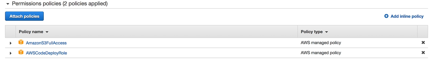 We now move on to setting up AWS CodeDeploy for our deployment process. Before we do this, we have to set up a new AWS role for CodeDeploy. This role will need the AWS code deploy policy as well as read/write access to S3. Mine looks like this: