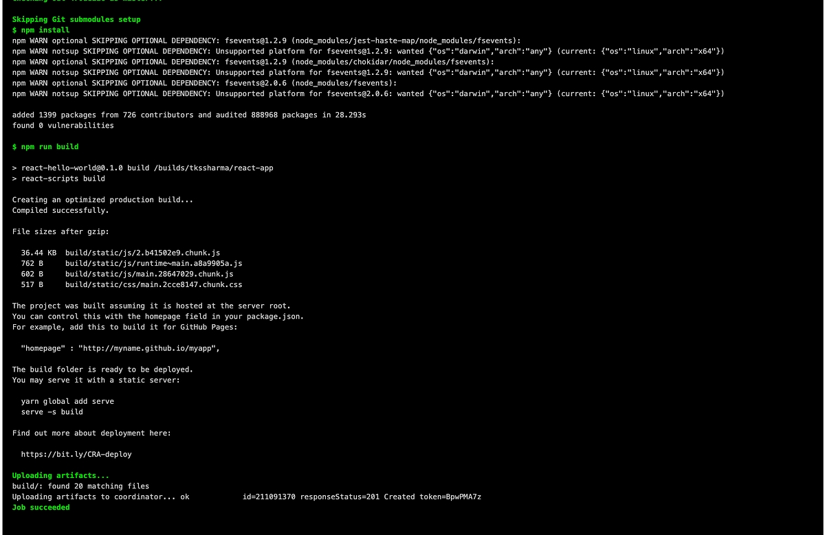 package.json— which for me looks something like:artifacts: Now this is what got me tripped up in the beginning. Since we have two stages in our deployment process (build and deploy) and they are both on two different images, we need a way for the second stage (deploy) to have access to our build folder —