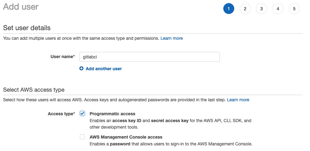 Navigate to the IAM Management Console and click the blue “Add user” button at the top. Give a descriptive username such as gitlabci and select “Programmatic access”