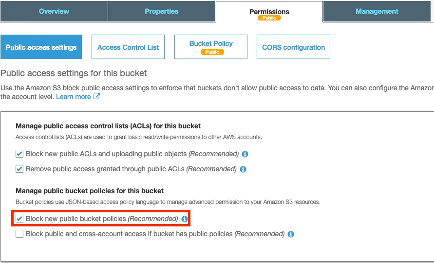 Head back over to the “Public Access Settings” tab and re-enable blocking new bucket policies:This ensures the bucket policy cannot be updated