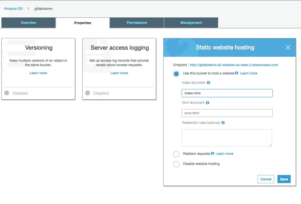 Note: If you want both stage and production environments, you will need to create a second bucket in S3 (with the same configuration as the first) and use that as the staging bucket.