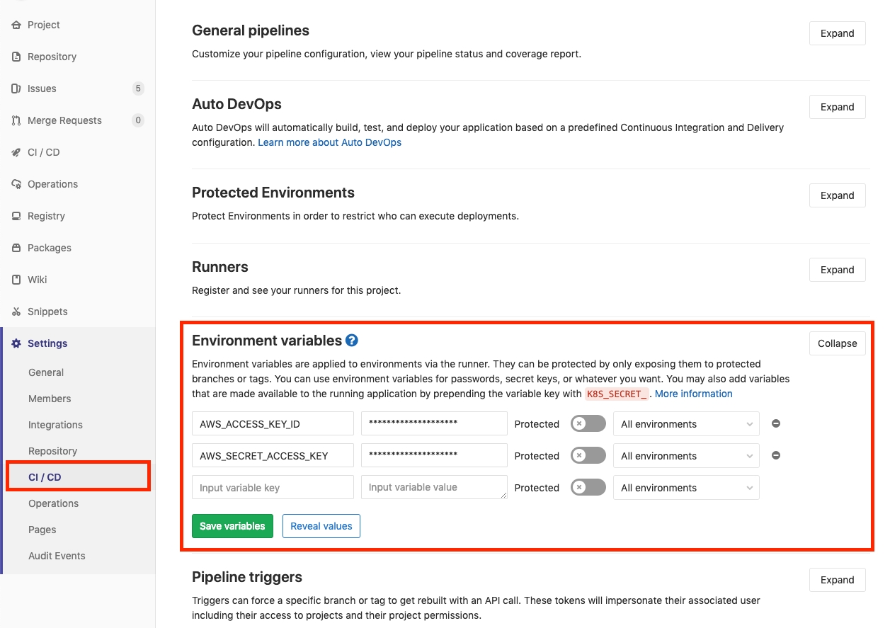 .gitlab-ci.ymland fill with our CI/CD stagesAdd our IAM credentials as environment variables