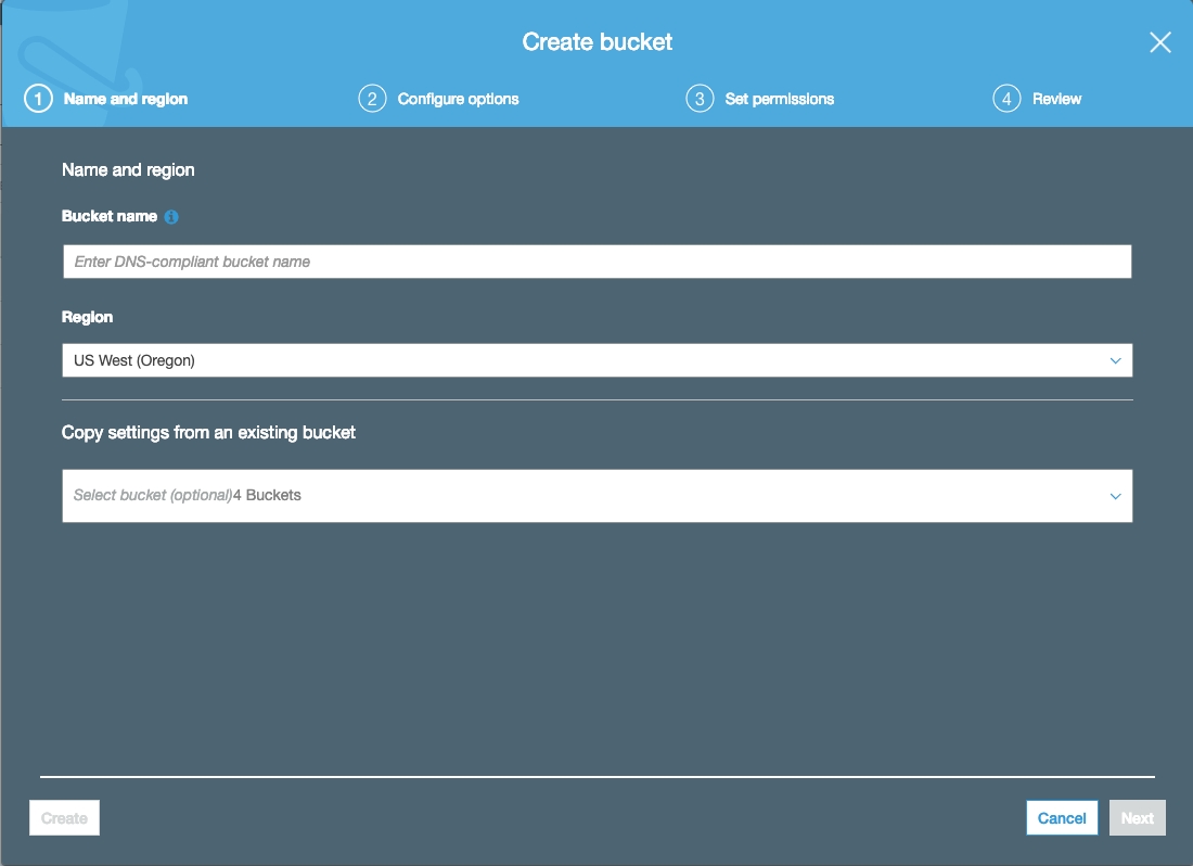 Once signed up, head over to the S3 console and click “Create Bucket”Create bucket modal