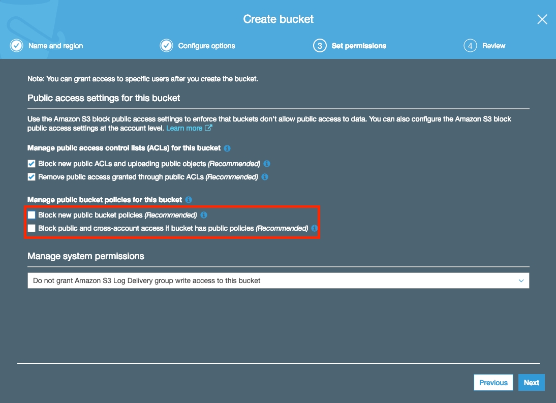 You will be shown this modal. Enter in a bucket name (remember this will be required to be unique across AWS). On the “Set Permissions” tab, ensure you uncheck “Block new public bucket policies” and “Block public and cross-account access if bucket has public policies”: