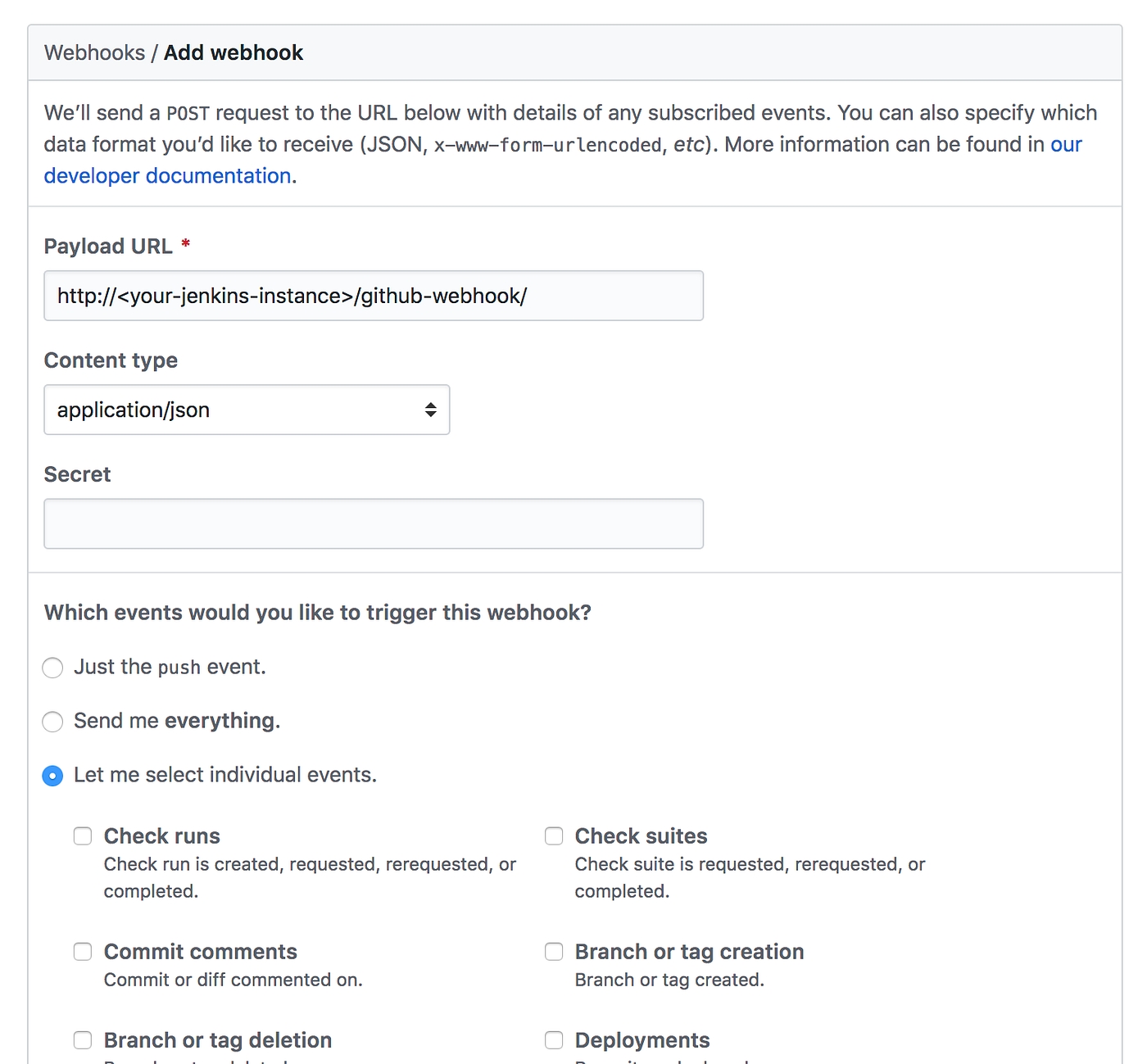 Select the individual events that you want to be used to trigger a new Jenkins build. I recommend to select Pushes and Pull Requests.
