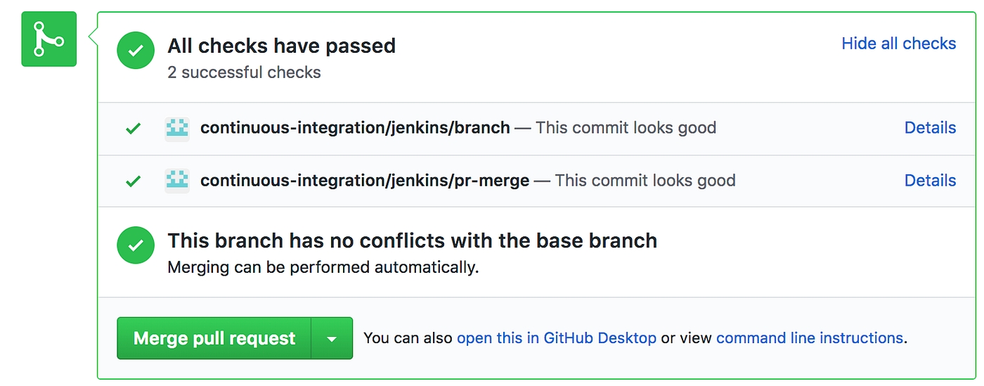 After that you will be able to see a similar message after a PR is created and it passes Jenkins validation:GitHub Pull Request Status
