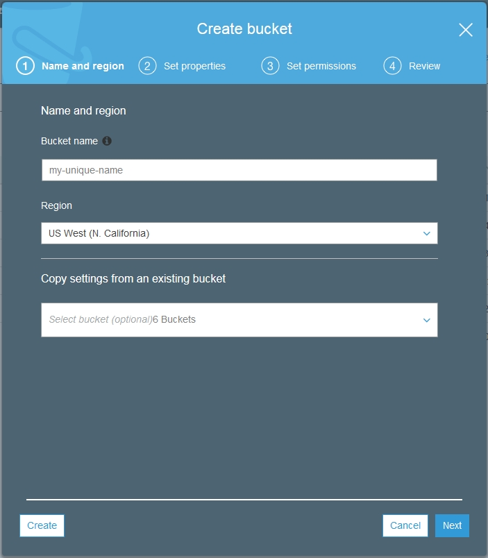 During the creation process picking a name for the S3 bucket can be a bit difficult, because bucket names have a global scope. This means that trying to use names like test will fail as they are taken by someone else.