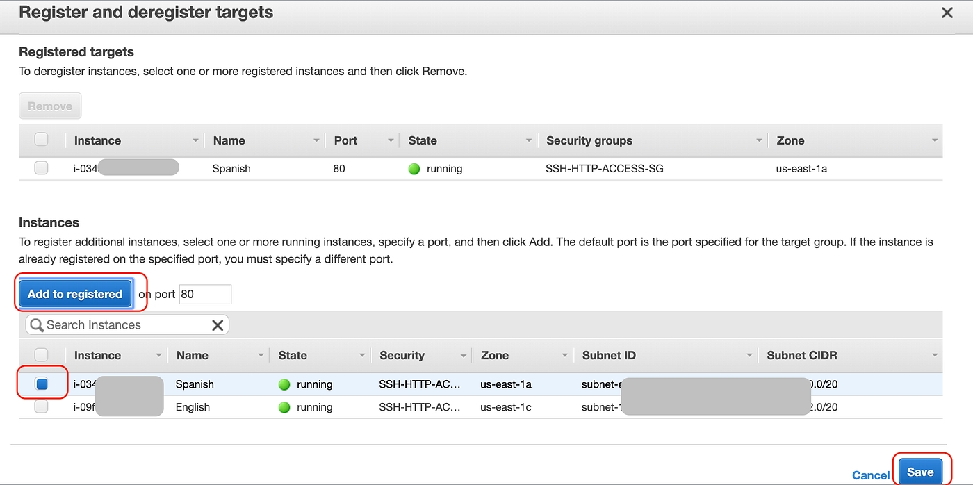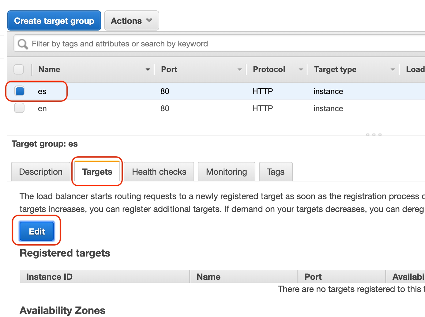 Next step is to add EC2 instances to the target groups. Select the target group switch to the Targets tab and click the Edit button.Adding Targets EC2 Instances to the groupsAssign your instances to the group