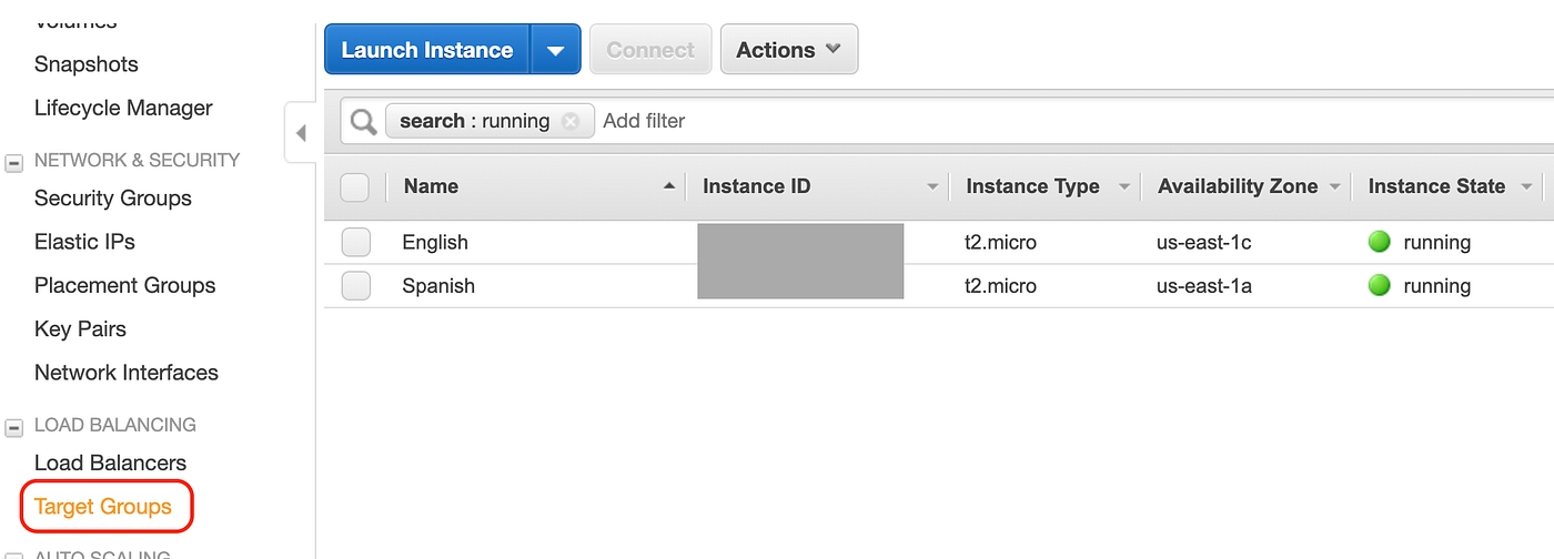 To start things click on the Target Groups under EC2 Instances We have 2 EC2 Instances running, click Target Groups link to start