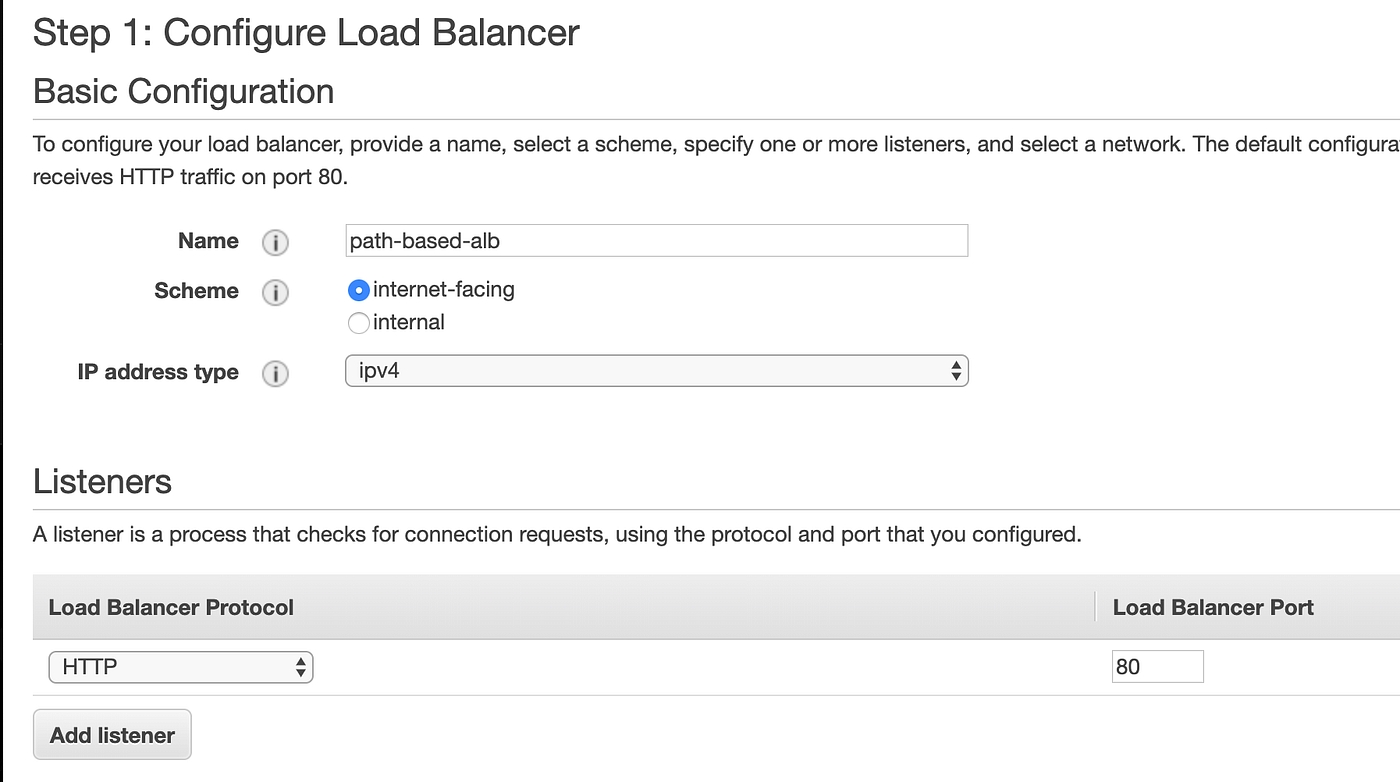 Name your load balancer and add ports that your ALB would be listening on ALB name and Ports