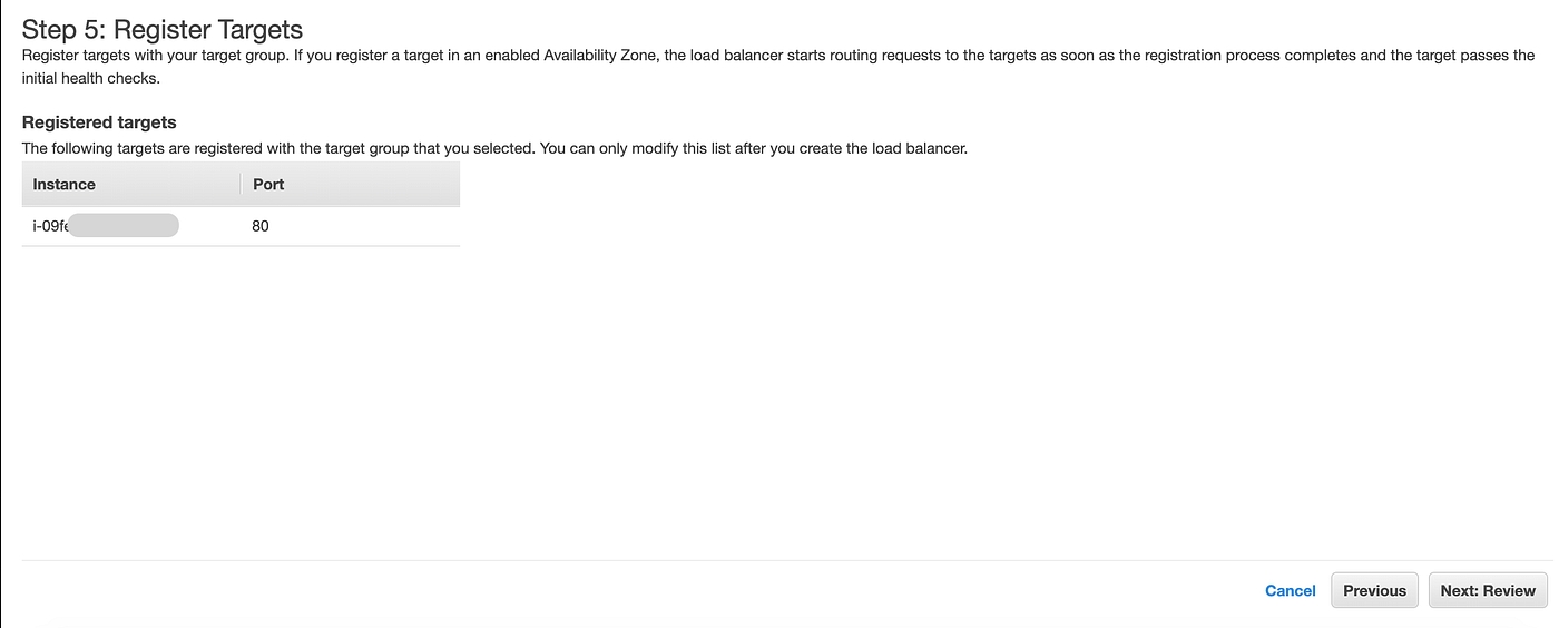 Since we already created Target group select the existing target group enfrom the listSelect or Create Target GroupReview Target Instances Review ALB settings and click Create