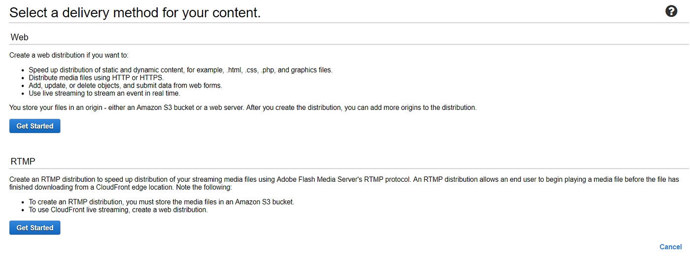 3. Now let’s configure the distribution on CloudFront console. After clicking on ‘Create Distribution’ given in step 1, we get this below shown console with 2 options.