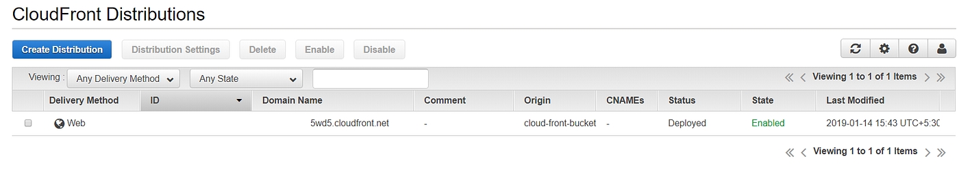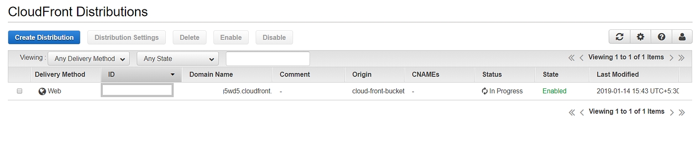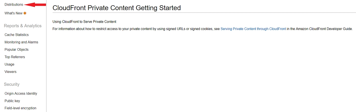 It’s normal to see a message just like above after we click on Create Distribution. It gives us the information on how to configure signed URLs for private content distribution(contents which customers pay to access). To see our newly created distribution, click on the option Distribution from the left panel.