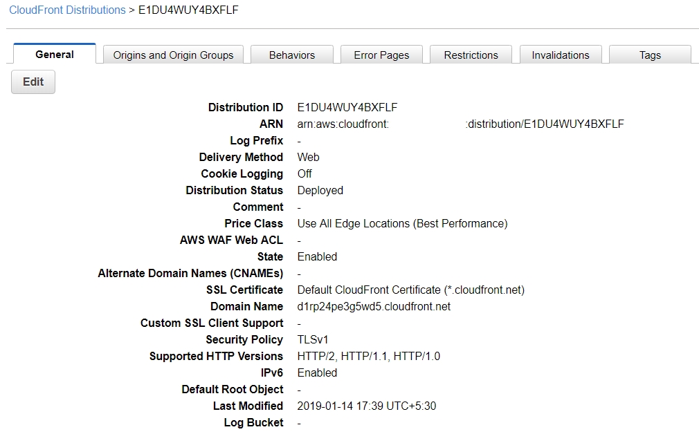 Next, I will try and access the same file using CloudFront URL, which we get from the General tab of the particular Distribution. Please refer to the below screenshot.Settings tab of CloudFront Distribution
