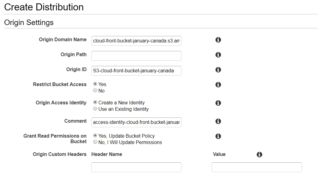 Having filled Origin Domain Name, Origin ID(it’s automatically populated), we now click ‘yes’ on Restrict Bucket Access which will enable the customers to use only the CloudFront URL and disable the S3 URL for everyone. You can also read about all these options by clicking on the small ‘i’ right next to each box. Next, we click on ‘Create New Identity’ for Origin Access and then Grant Read Permissions on Bucket.