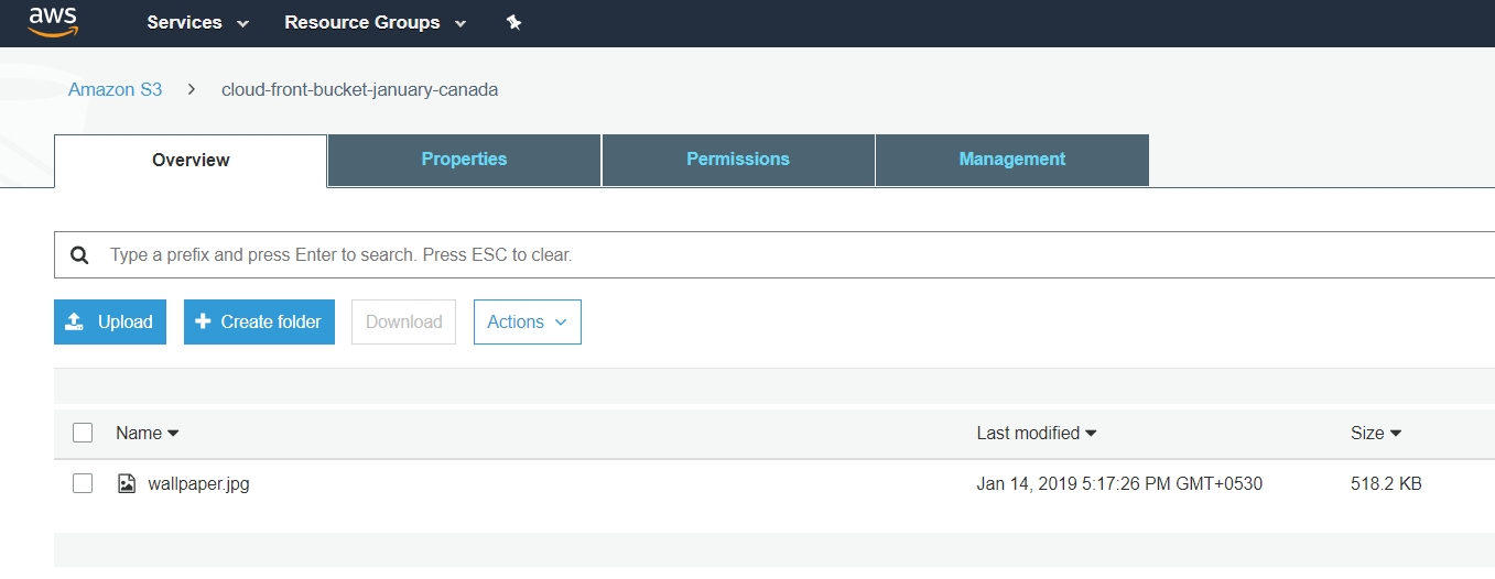 I am currently working from Mumbai region and so created an S3 bucket named cloud-front-bucket-january-canada in Canada region for this illustration. Permissions for the file need to be set in a way so that it’s accessible for the public for now.