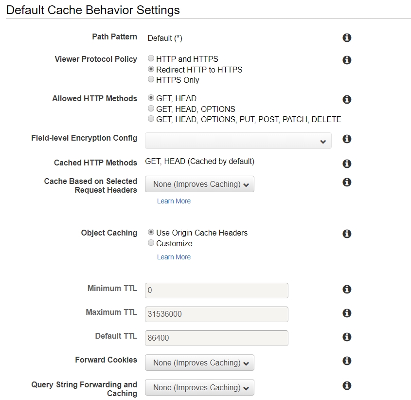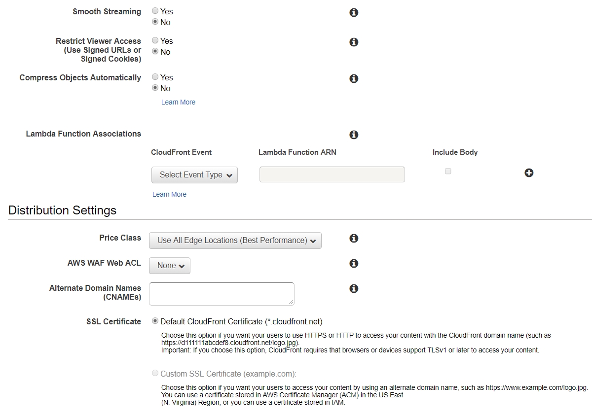 Selecting “Redirect HTTP to HTTPS” helps anyone to view the content accessing the URL using either of the prefixes. If we select ‘HTTPS only’ option, which in fact is a secure option, anyone using HTTP as a prefix will face an error and will not be able to access the content. Rest of the options are kept in default values. The TTL(Time to Live) values represent the time for which the data exist in Edge Locations. The unit of the TTL is seconds.